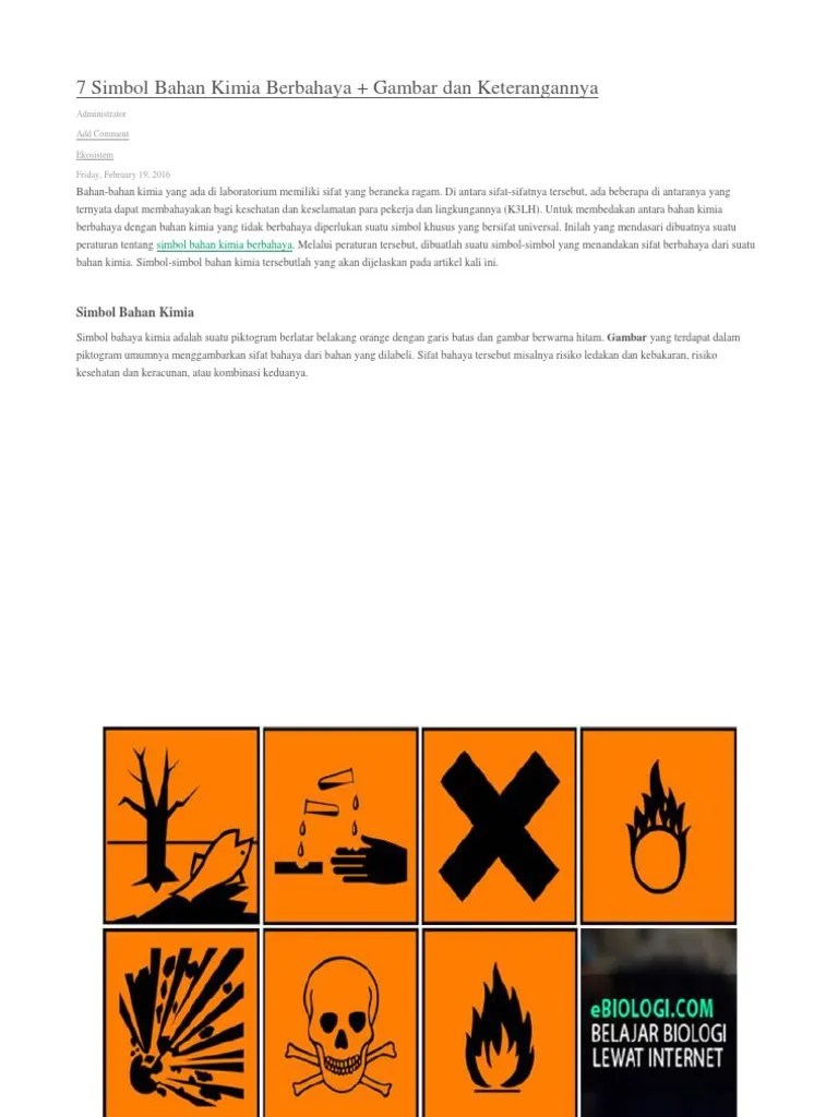 Disebabkan kurangnya sosialisasi mengenai hal tersebut. Contoh bahan kimia yang bersifat korosif adalah asam sulfat, asam cuka, asam nitrat, asam klorida, dll. Bahan dan formulasi yang ditandai dengan notasi bahaya „explosive". Beberapa contoh bahan kimia oksidator seperti: Simbol ini menunjukkan bahan kimia yang dapat merusak jaringan hidup saat terjadi kontak. ○bahan kimia mudah meledak bila reaksi kimia bahan tersebut menghasilkan gas dlm jumlah dan tekanan yg besar serta. Contoh bahan kimia yang bersifat korosif adalah asam sulfat, asam cuka . Contoh bahan kimia ini adalah propane (gas) dan dietileter (cairan). Salah satu contoh bahan yang menggunakan kode xn adalah peridin. Simbol bahan kimia ini menandakan bahwa . Bahan kimia tersebut sifatnya beraneka ragam. Contoh bahan kimia dengan simbol ini adalah iodine, toluene, petroleum benzine, benzyl alkohol, hidrogen peroksida, kalium hidroksida, . Bahan kimia mudah meledak explosive.